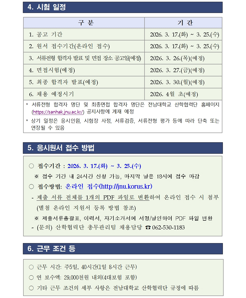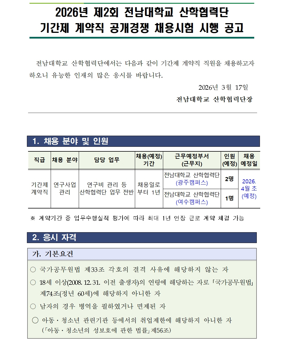 2026년 제2회 전남대학교 산학협력단 기간제 계약직 공개경쟁 채용시험 시행 공고