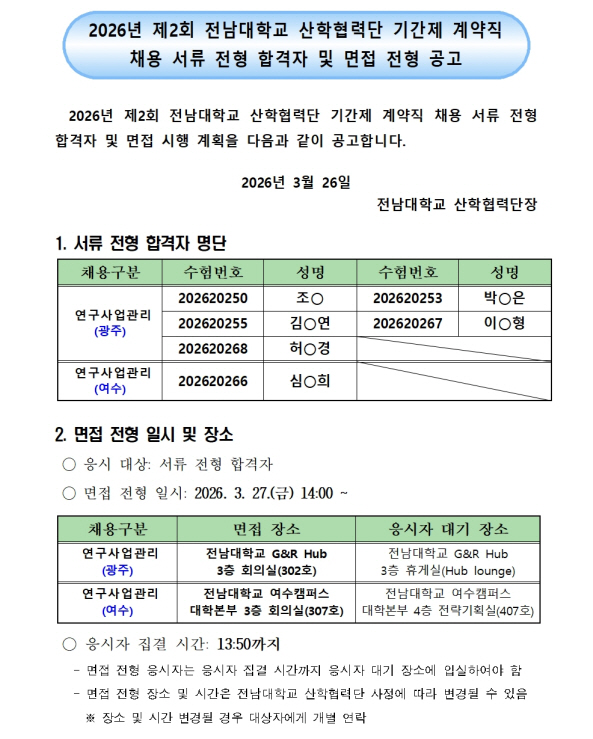 2026년 제2회 전남대학교 산학협력단 기간제 계약직 채용 서류전형 합격자 및 면접전형 공고